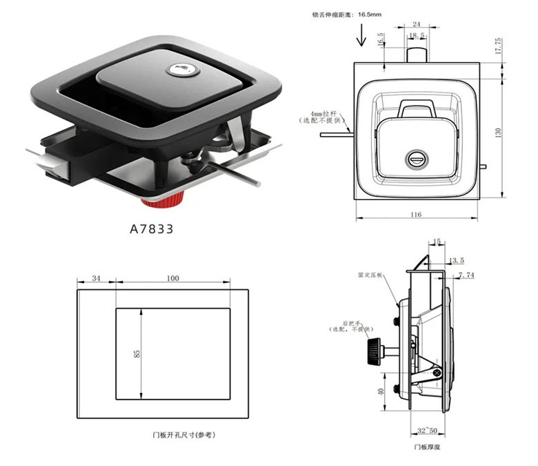 新利官网A7833系列平面锁,采用碳素钢黑色喷涂面板,锌合金黑色锁体。安装适配性高,专业防撞设计和防松设计,具有防盗防撬,防腐蚀抗老化等功能,IP65防护等级,可应对各种严苛的户外环境。客户可根据工具箱的整体设计需求,选择不同材质、表面处理、尺寸的提拉式面板锁。
