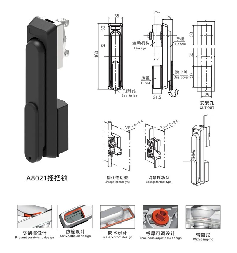 新利官网A8021抬拉摇把锁,采用锌合金镀锌传动壳和不锈钢材质,防刮擦、防撞、防水设计,板厚可调节,带阻尼,IP65防护等级经久耐用,安装简单方便。广泛应用于各种通讯控制柜、网络机柜、配电箱机柜等工业机柜。